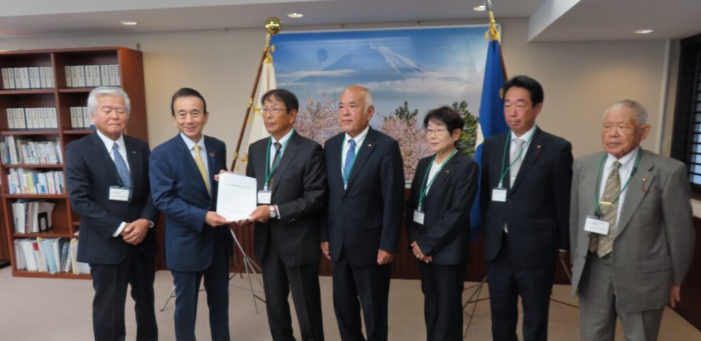 農業会議は10月22日、令和8年度の県農業施策に関する要望書を鈴木康友知事に提出した。要望書は、県内35市町の農業委員会からの声を7分野23項目にとりまとめた。このうち9月の台風15号で被災した農業者の営農再開支援や営農型太陽光発電の健全な発展、農地中間管理事業に関する手数料無償化、農業の担い手育成・確保の推進などを、知事に直接要望した。
